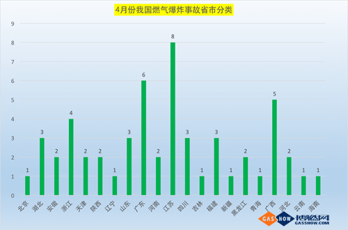 2017年4月發(fā)生燃?xì)獗ㄊ鹿是?位省份依次為江蘇省(8起)、廣東?。?起)、廣西?。?起)、浙江?。?起)、湖北?。?起)、山東?。?起)、四川省(3起)、福建省(3起)。